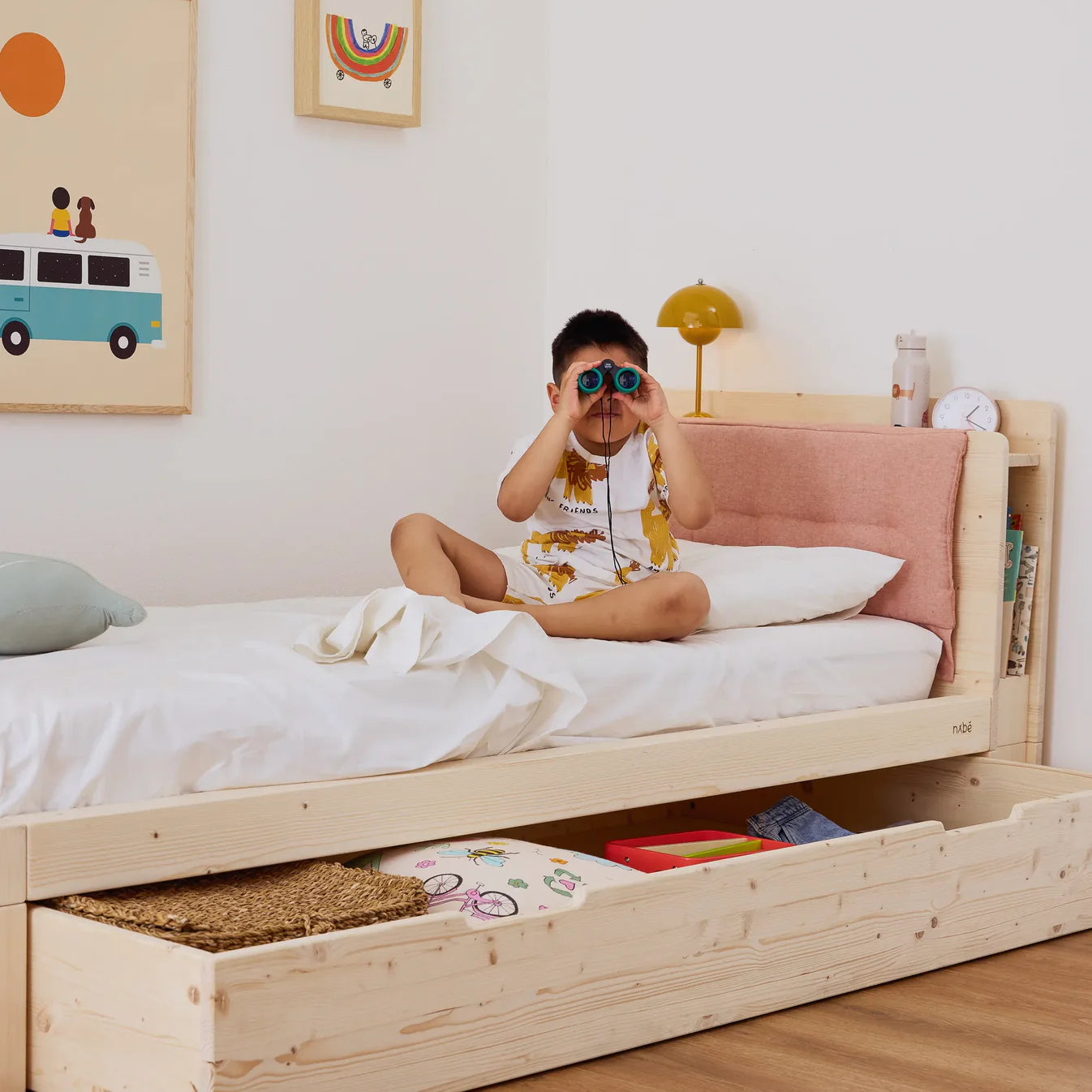 Das zero+ Fun Bett mit Kopfteil mit Stauraum, ohne Bettgitter, inklusive mitwachsender Matratze, Kissen, Kopfteil-Polsterung und dem piedOni-Set gratis dazu, ist die mitwachsende Lösung für Kinder ab 6 Jahren. Verdopple den Platz mit dem ausziehbaren Bettkasten zero+ – wähle zwischen der Aufbewahrungsversion oder dem zweiten Bett.
