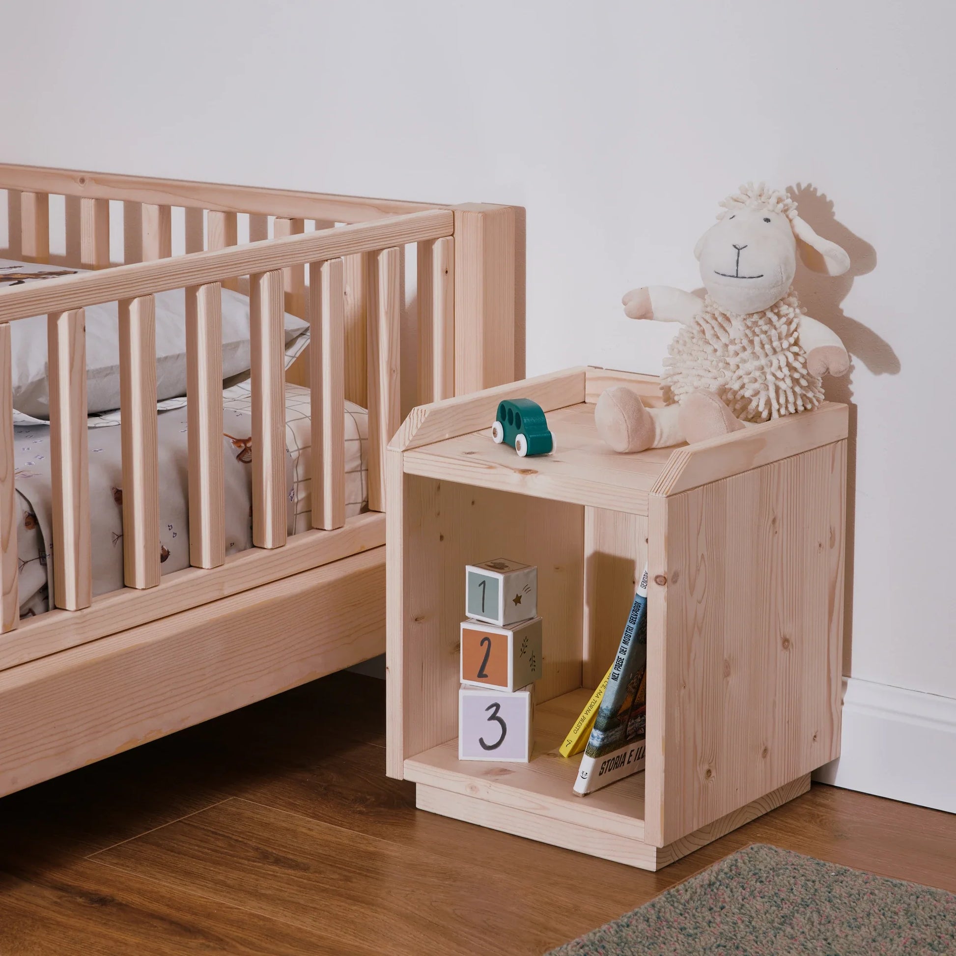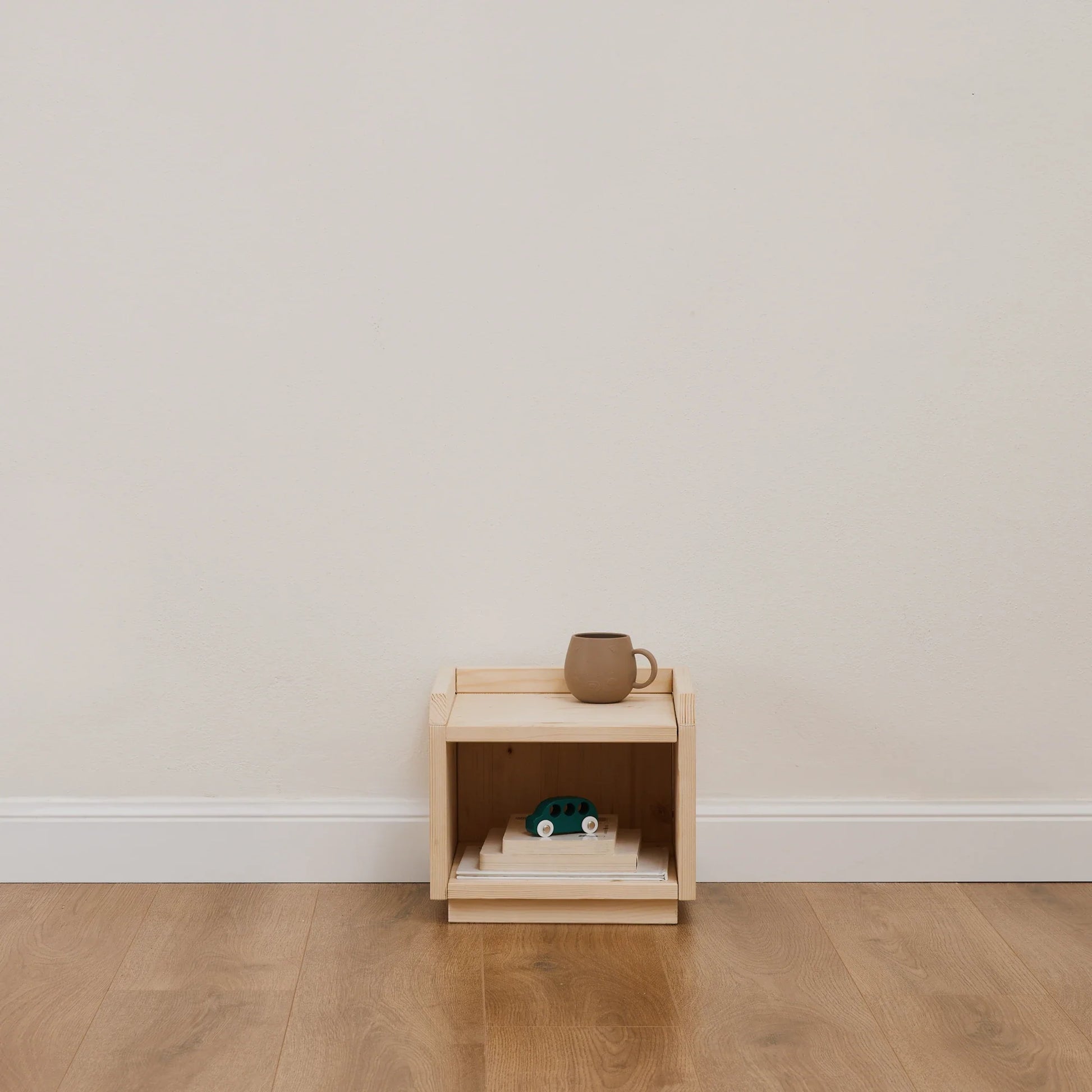 Jede Version verfügt über eine kleine Schutzkante, ein dezentes Detail, das Bücher und Gegenstände sicher an ihrem Platz hält und den Nachttisch auch für die selbstständige Nutzung durch Kinder zuverlässig macht.