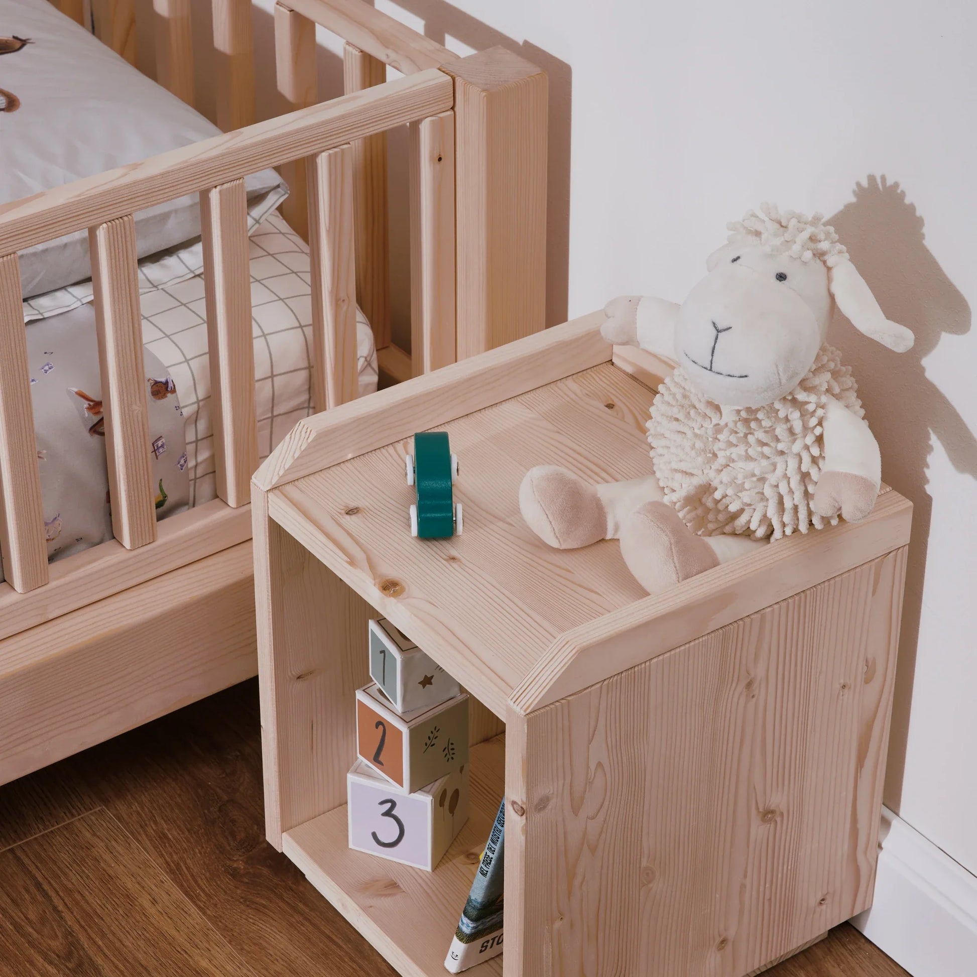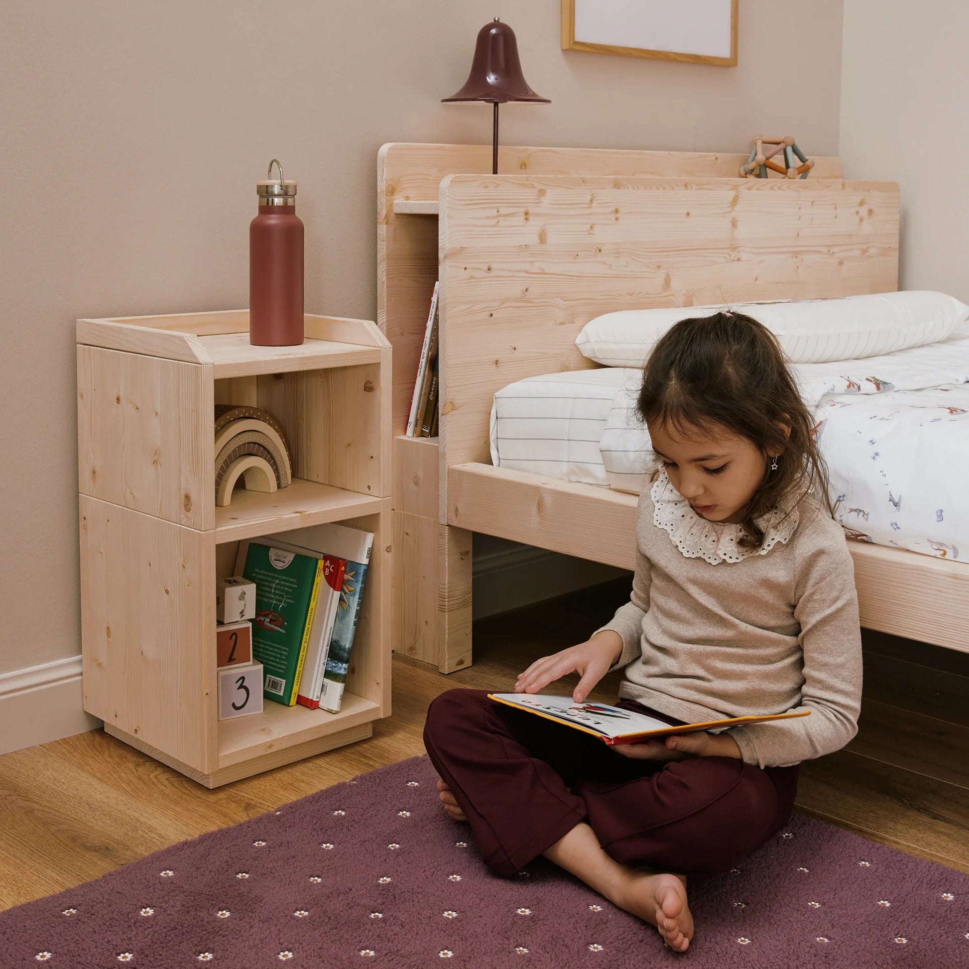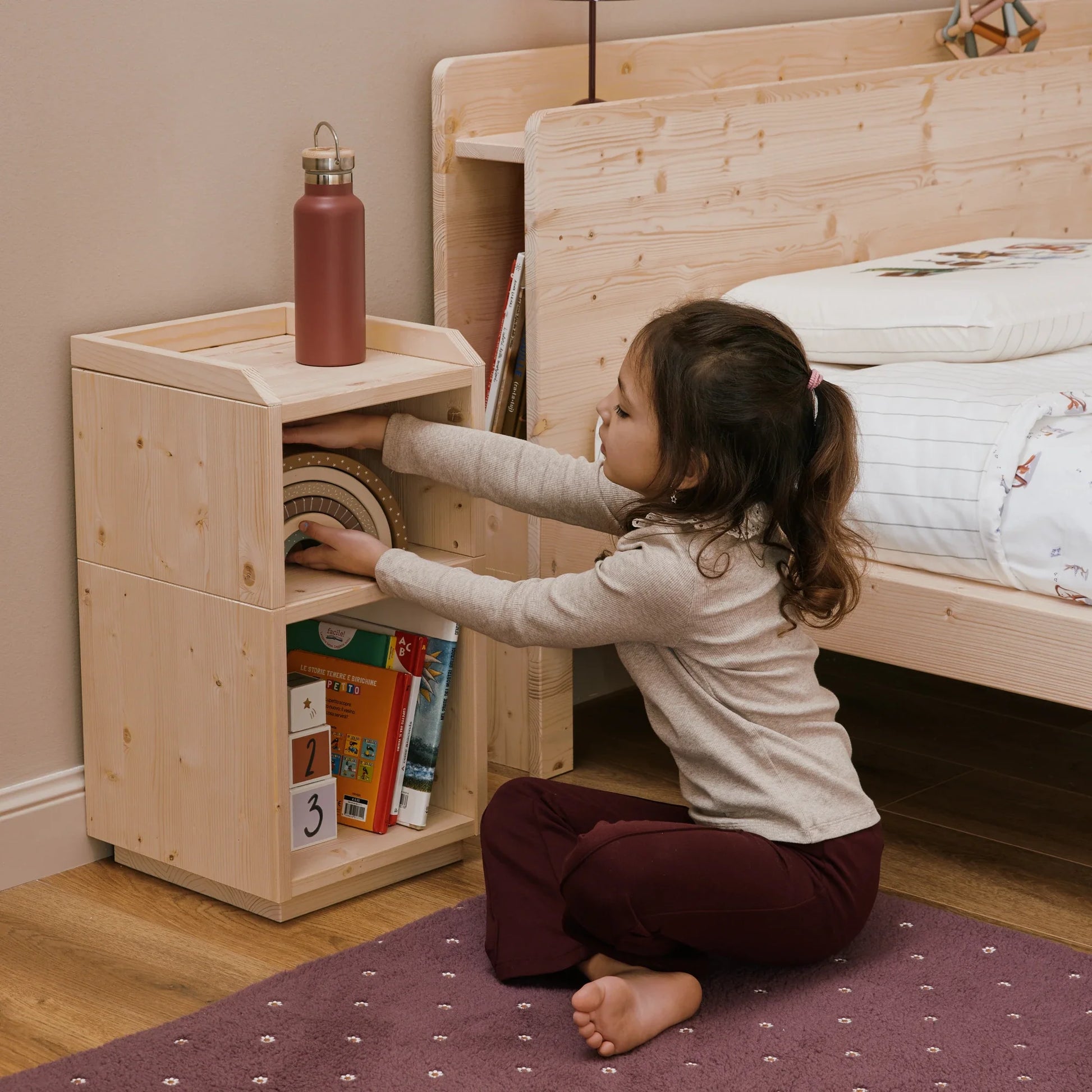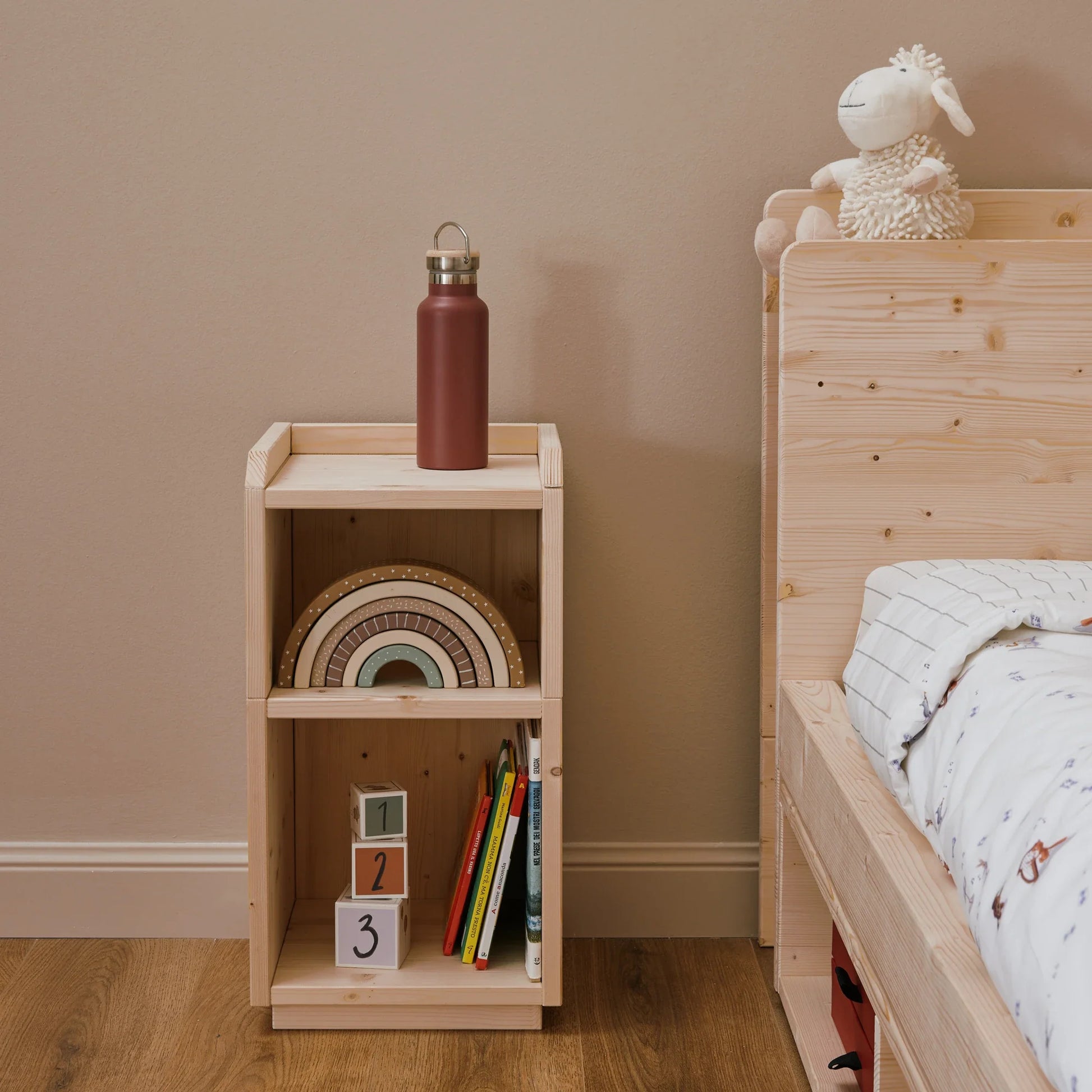 Der Nachttisch ist Teil des EverGrow Systems und harmoniert perfekt mit anderen Möbeln der Kollektion, wie dem Montessori Bett zero+ und der mitwachsenden EverGrow Bücherregal.