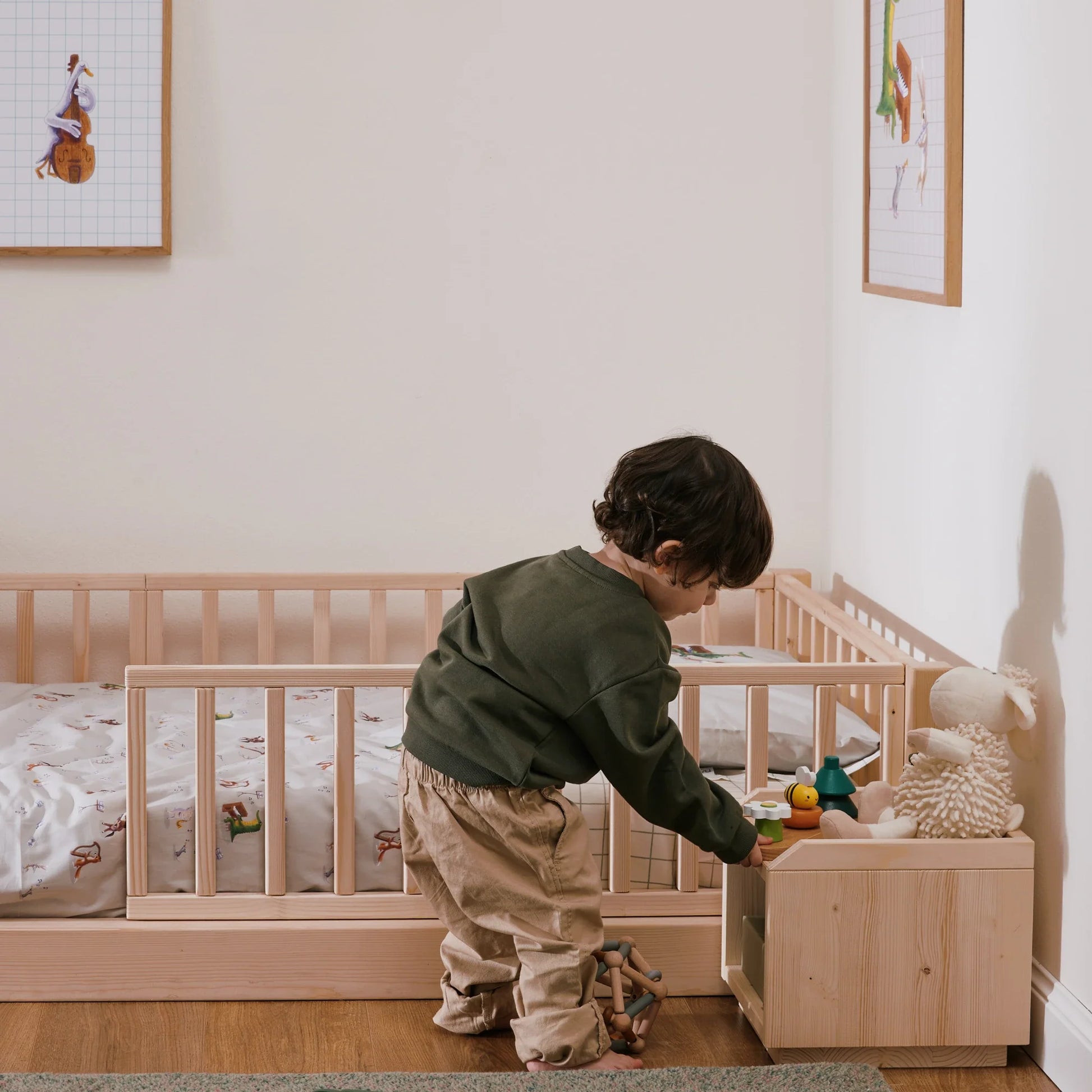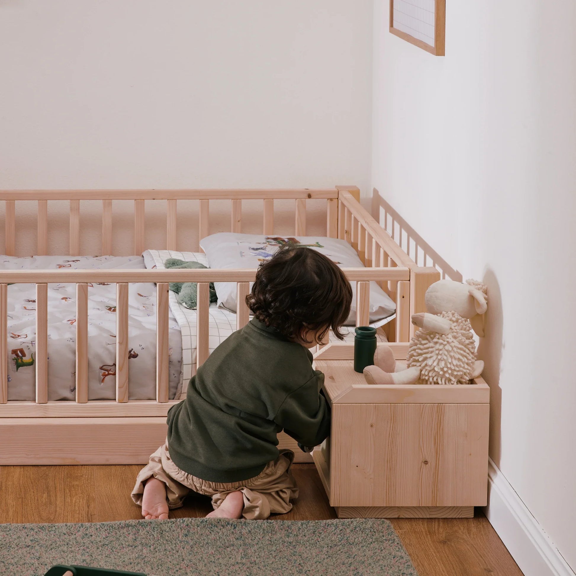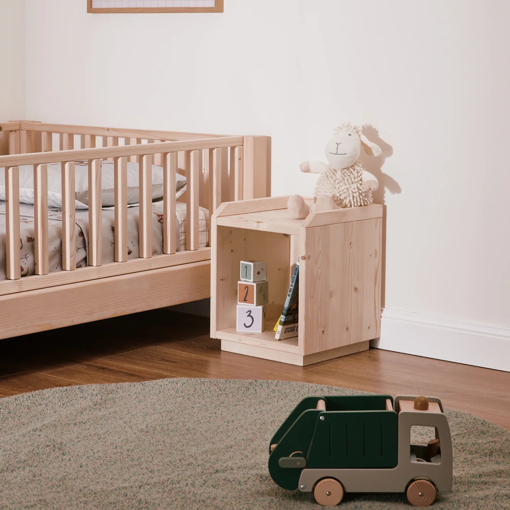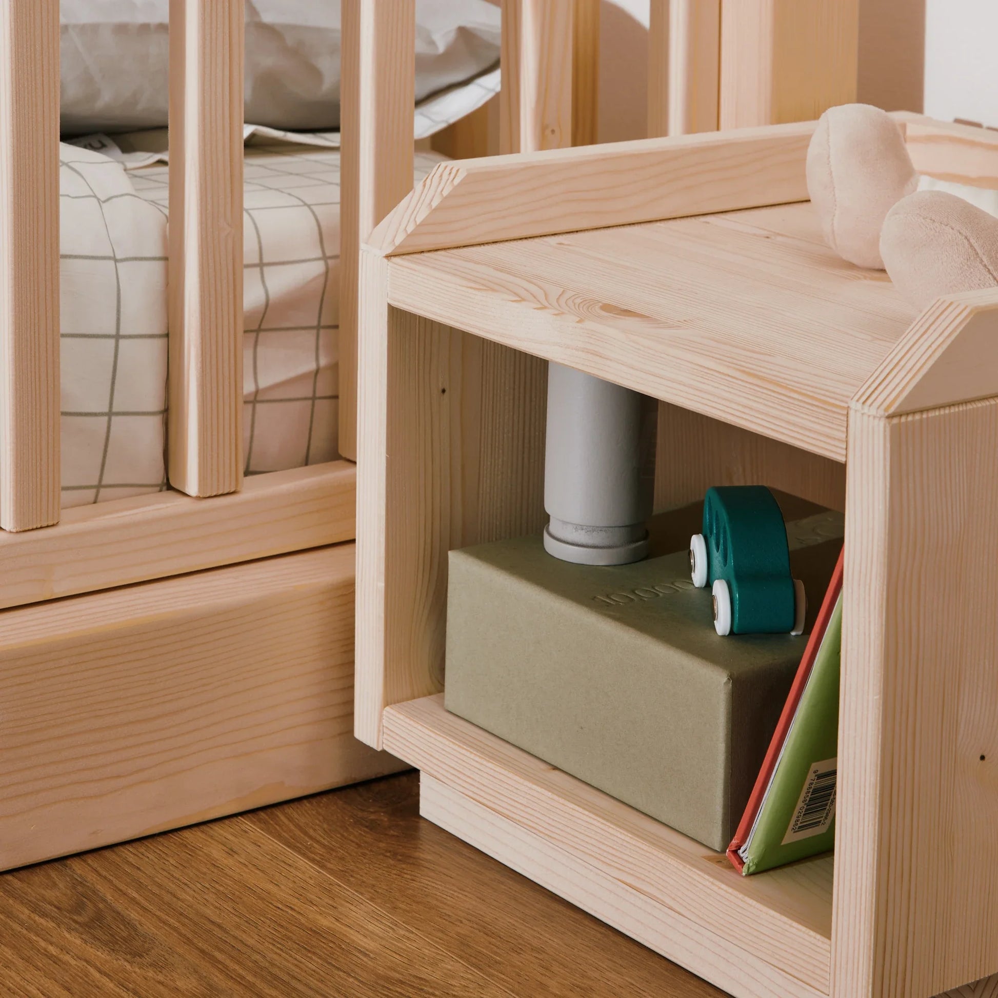 Der Nachttisch ist Teil des EverGrow Systems und harmoniert perfekt mit anderen Möbeln der Kollektion, wie dem Montessori Bett zero+ und der mitwachsenden EverGrow Bücherregal.