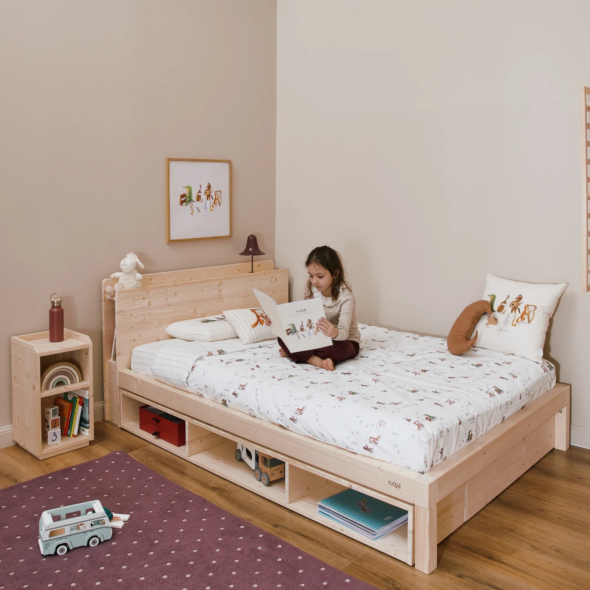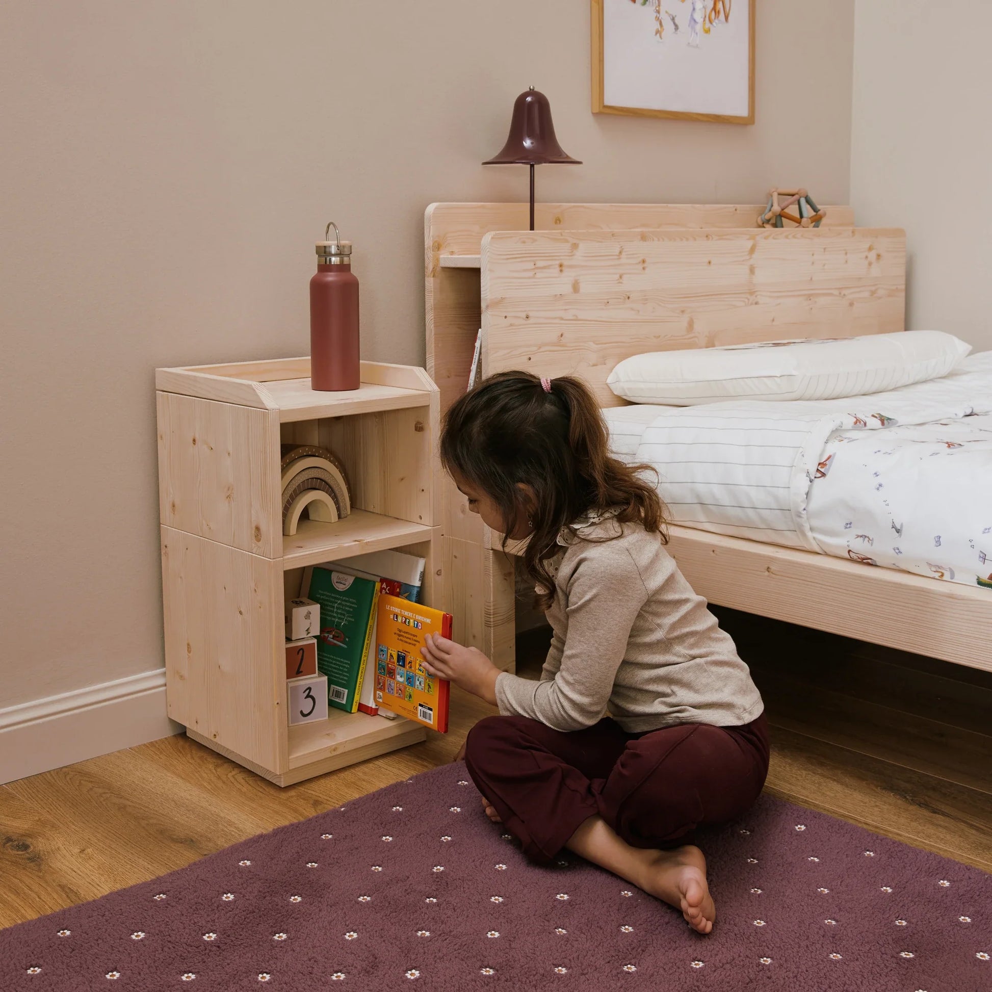 Der mitwachsende Nachttisch EverGrow begleitet Kinder beim Großwerden. Erhältlich in drei Größen S, M und L und immer bodennah positioniert – ohne Befestigungen oder Wandmontage. Eine Lösung, die Stabilität, Sicherheit und Bewegungsfreiheit garantiert. Durchdachte Höhen, leicht zugängliche Ablagen und eine offene Struktur laden Kinder dazu ein, selbst zu wählen.