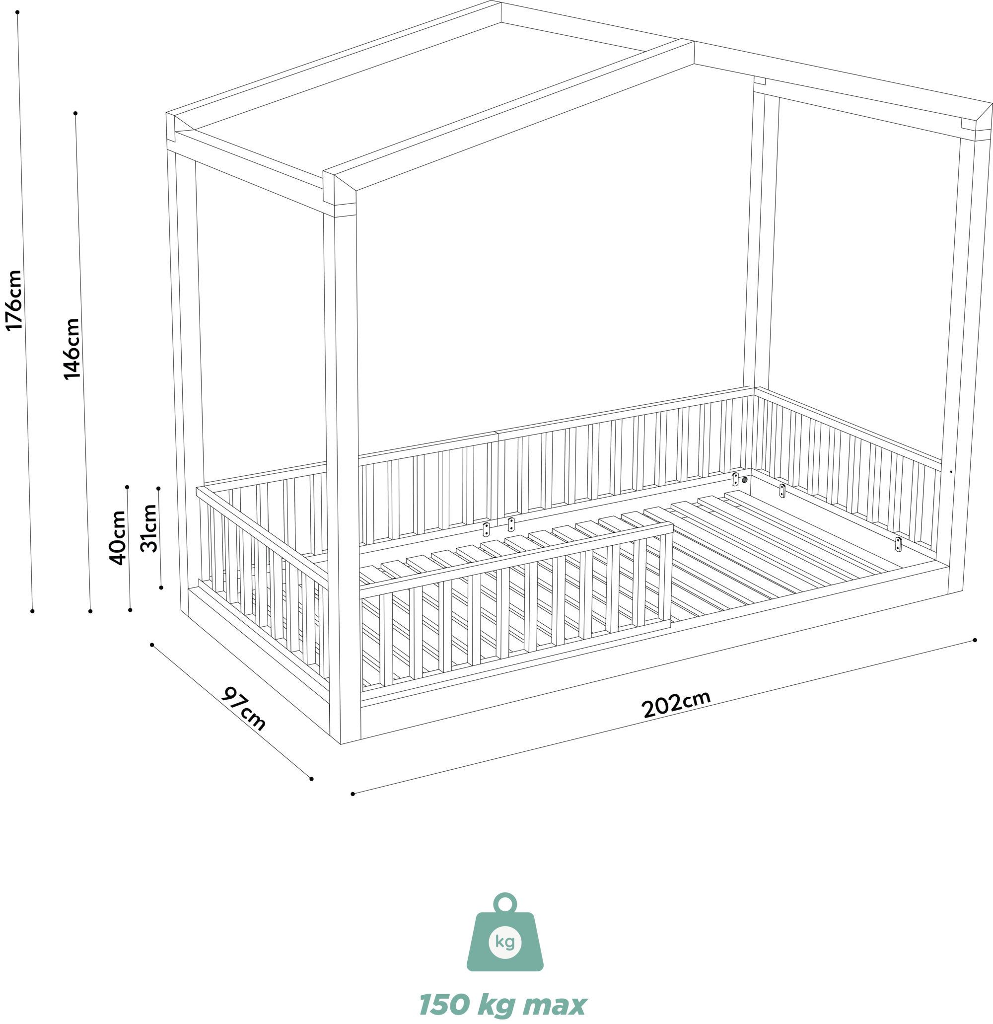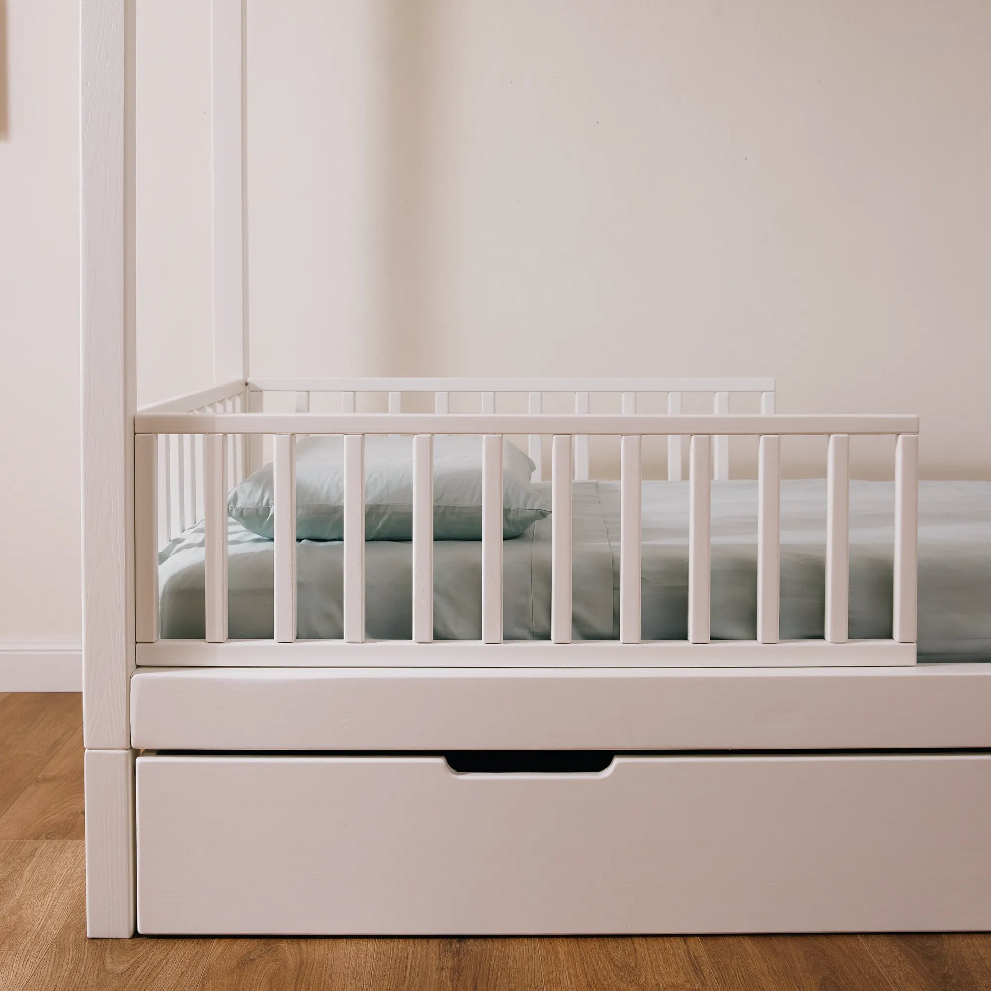 Das klassische Montessori Hausbett, bodentief aufgestellt, fördert die Selbstständigkeit der Kleinen. Für maximale Sicherheit sorgt das komplette Set Bettgitter.