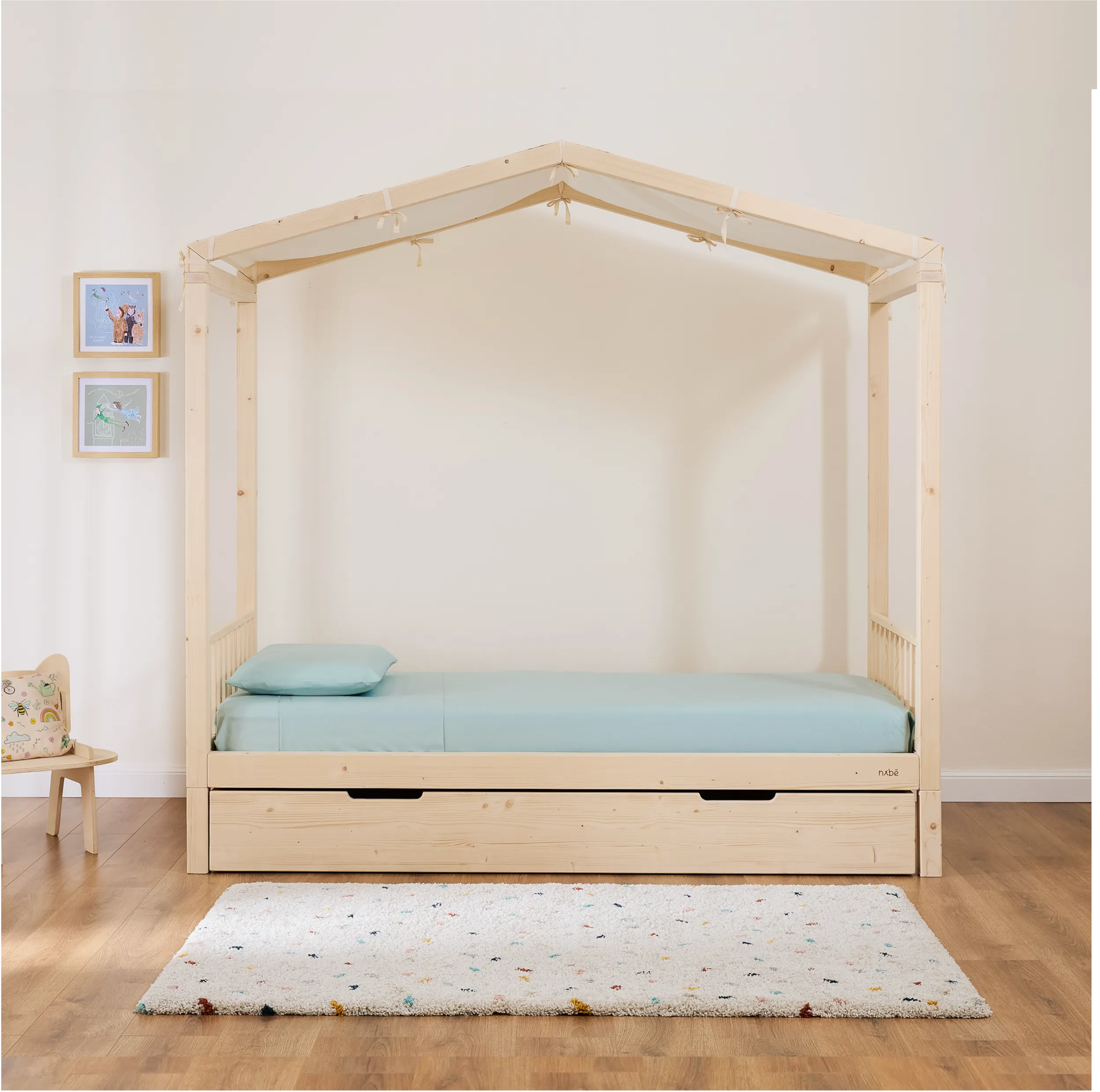 zero+ Dream ist das mitwachsende Hausbett von nabè, das Kinderträumen eine Form gibt. Es erschafft für Kinder ihren ganz eigenen Raum zum Schlafen und Spielen. Das Hausbett mit Dach oder Baldachin wird sofort zum neuen Lieblingsort der Kinder, der zum Lesen, Kuscheln und Träumen einlädt. Die Höhen und Formen wurden bis ins Detail entwickelt, damit sie eine beruhigende, harmonische Atmosphäre im Kinderzimmer verströmen und die täglichen Abläufe erleichtern.
