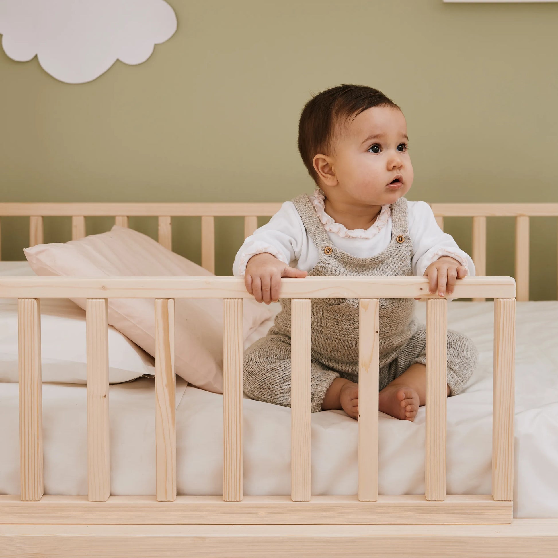 Das klassische Montessori Bodenbett – ideal, um die Selbstständigkeit der Kleinen zu fördern. Das komplette Bettgitter-Set sorgt dabei für maximale Sicherheit.