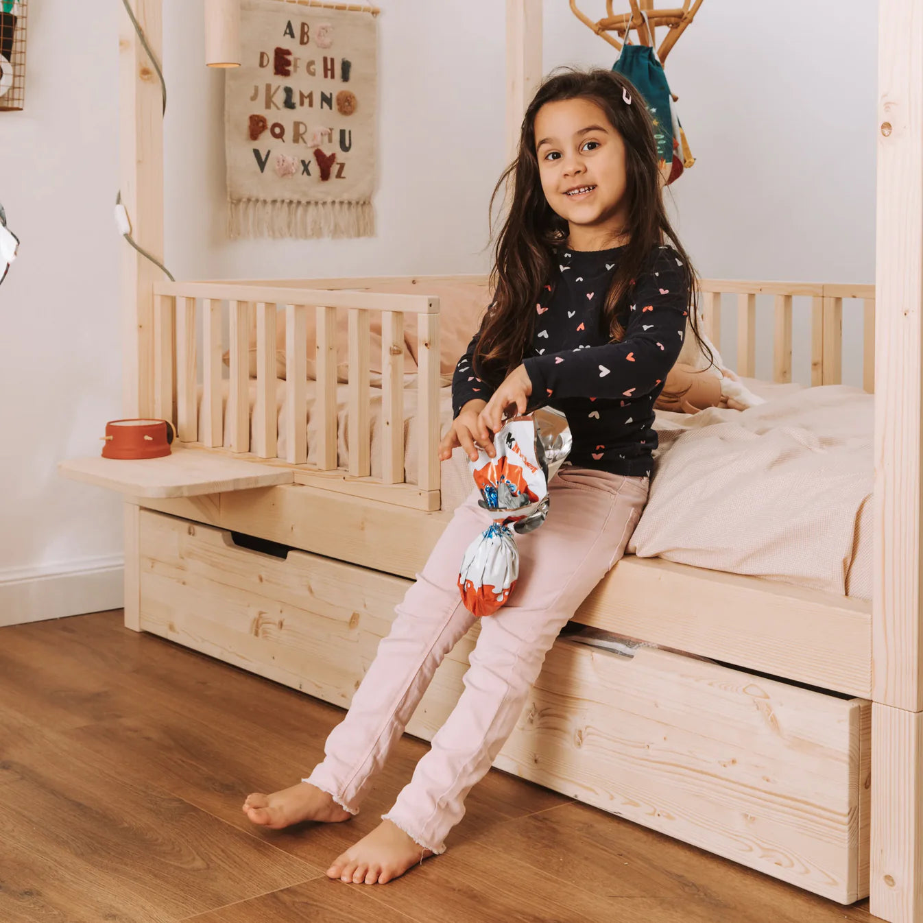 Beide Varianten lassen sich jederzeit ineinander verwandeln – einfach Lattenrost oder Holzplatten tauschen und schon passt sich der Bettkasten neuen Bedürfnissen an. So wächst er mit – wie die Kleinen selbst.