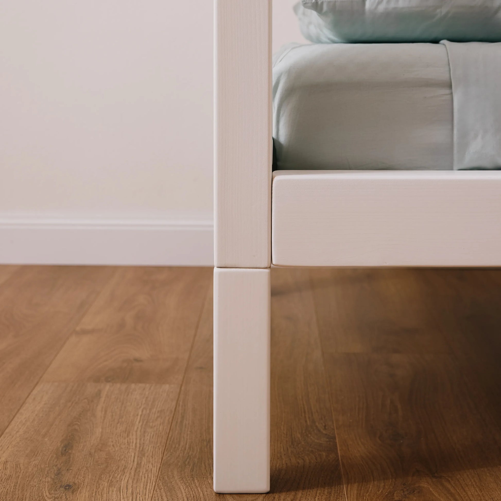Das Holz ist das von immer; 100% Massivholz, und die Verwendung von biologischen Wasserlacken bewahrt seine charakteristischen Merkmale wie Maserungen, Äste und lebendige Stellen, wodurch jedes Bett einzigartig und authentisch wird.