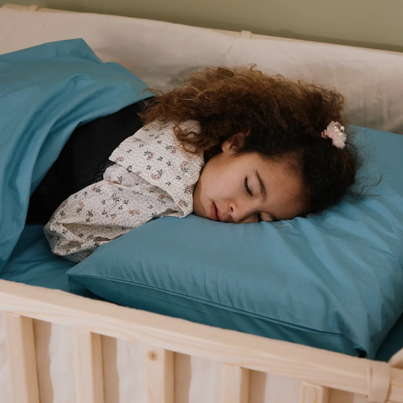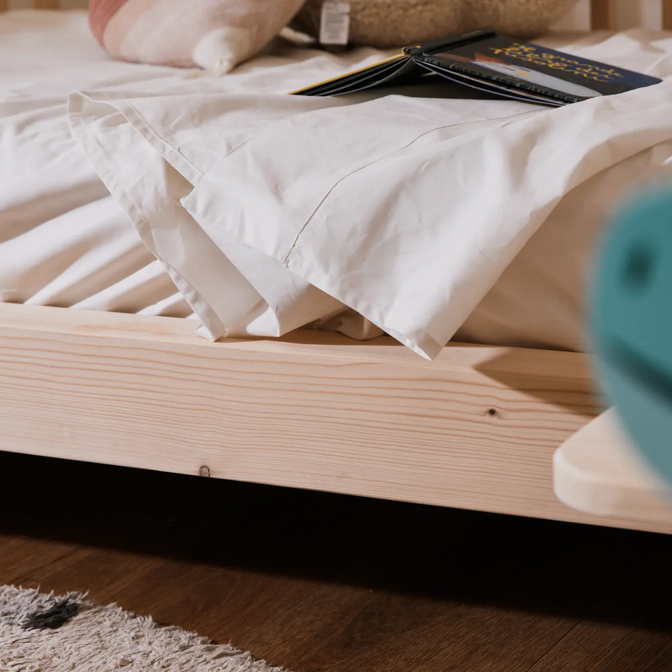 Für ein zeitloses Design haben wir ein Bettwäsche-Set in Unifarbe entwickelt, das sich wunderbar mit dem natürlichen Holzton und jeder Kinderzimmereinrichtung kombinieren lässt.