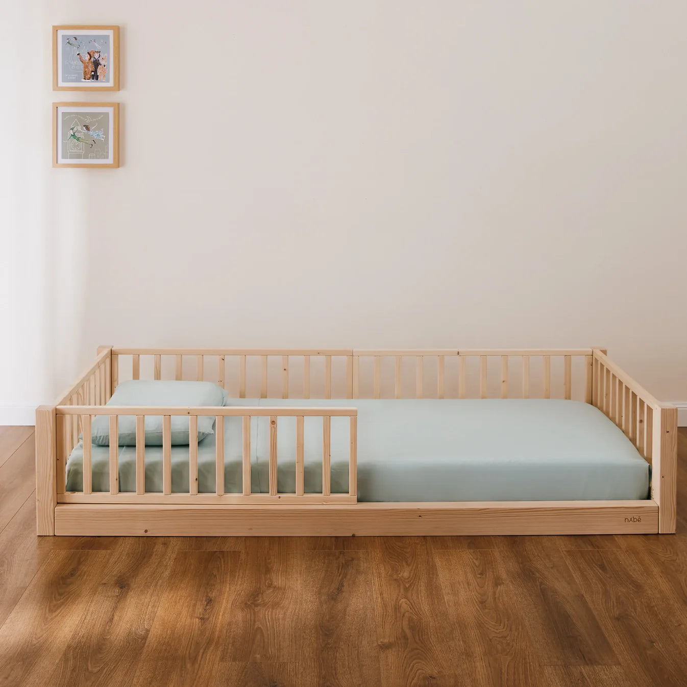 Beginnt als Bodenbett nach Montessori – fördert die Selbstständigkeit von Anfang an. Und wächst dann mit, Schritt für Schritt. Mit wenigen Handgriffen wird daraus ein Bett, das sich den Bedürfnissen wachsender Kinder anpasst – für jede neue Entwicklungsphase, ohne Kompromisse.