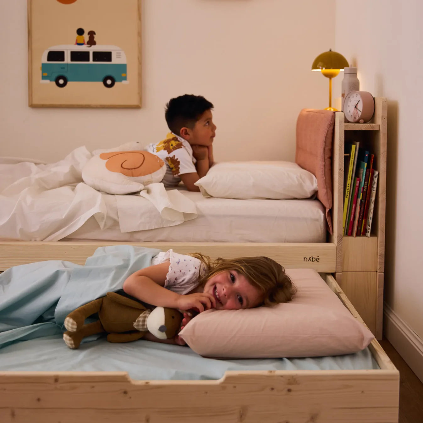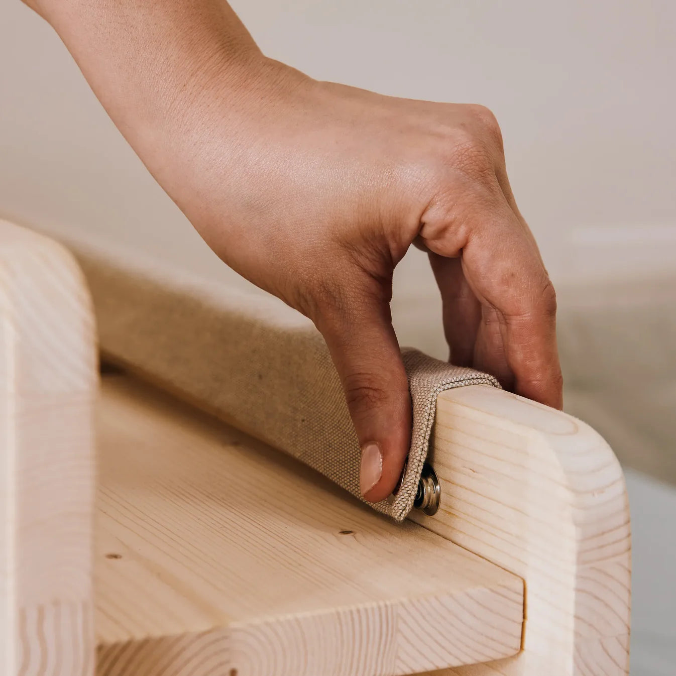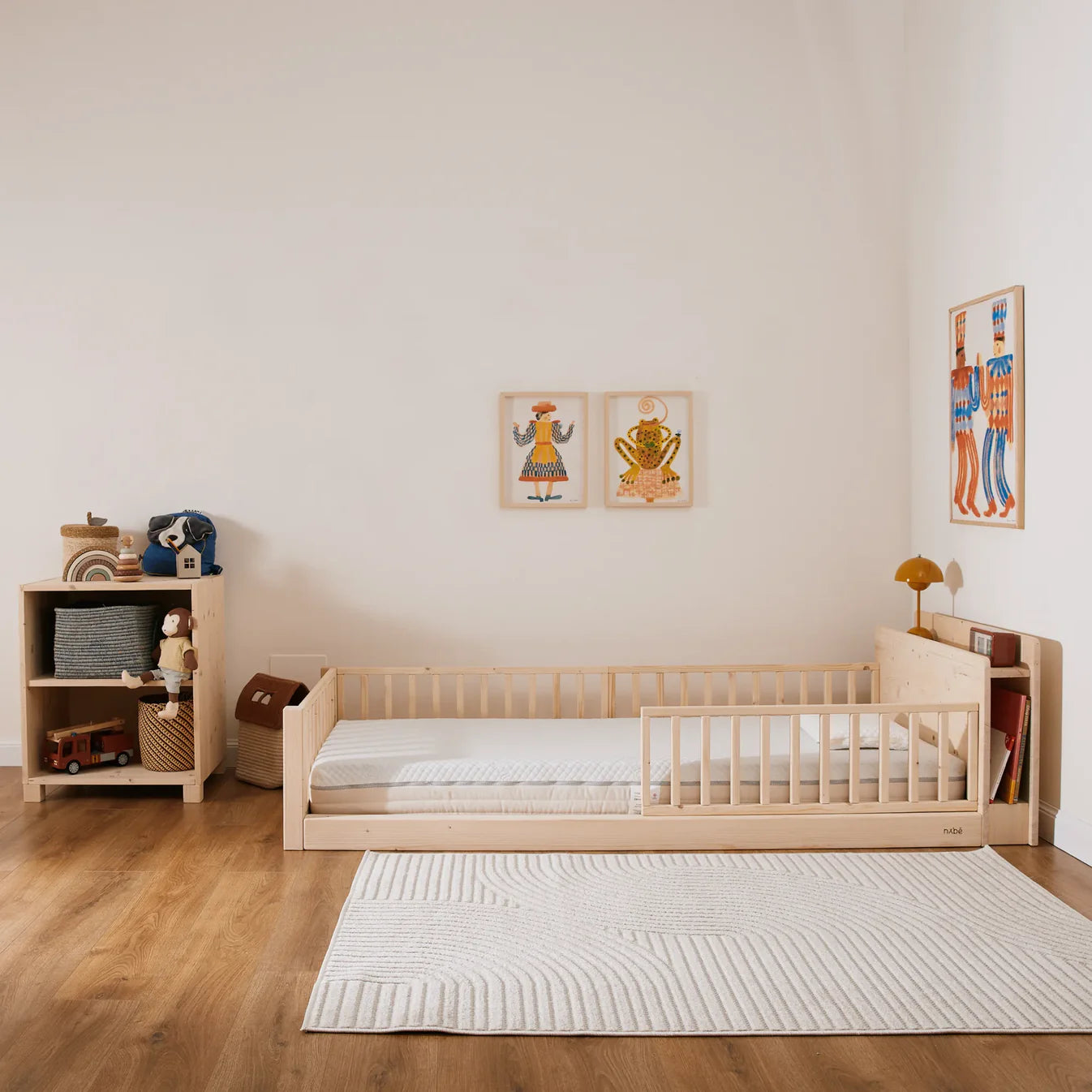 Beginnt als Bodenbett nach Montessori – fördert die Selbstständigkeit von Anfang an. Und wächst dann mit, Schritt für Schritt. Mit wenigen Handgriffen wird daraus ein Bett, das sich den Bedürfnissen wachsender Kinder anpasst – für jede neue Entwicklungsphase, ohne Kompromisse.