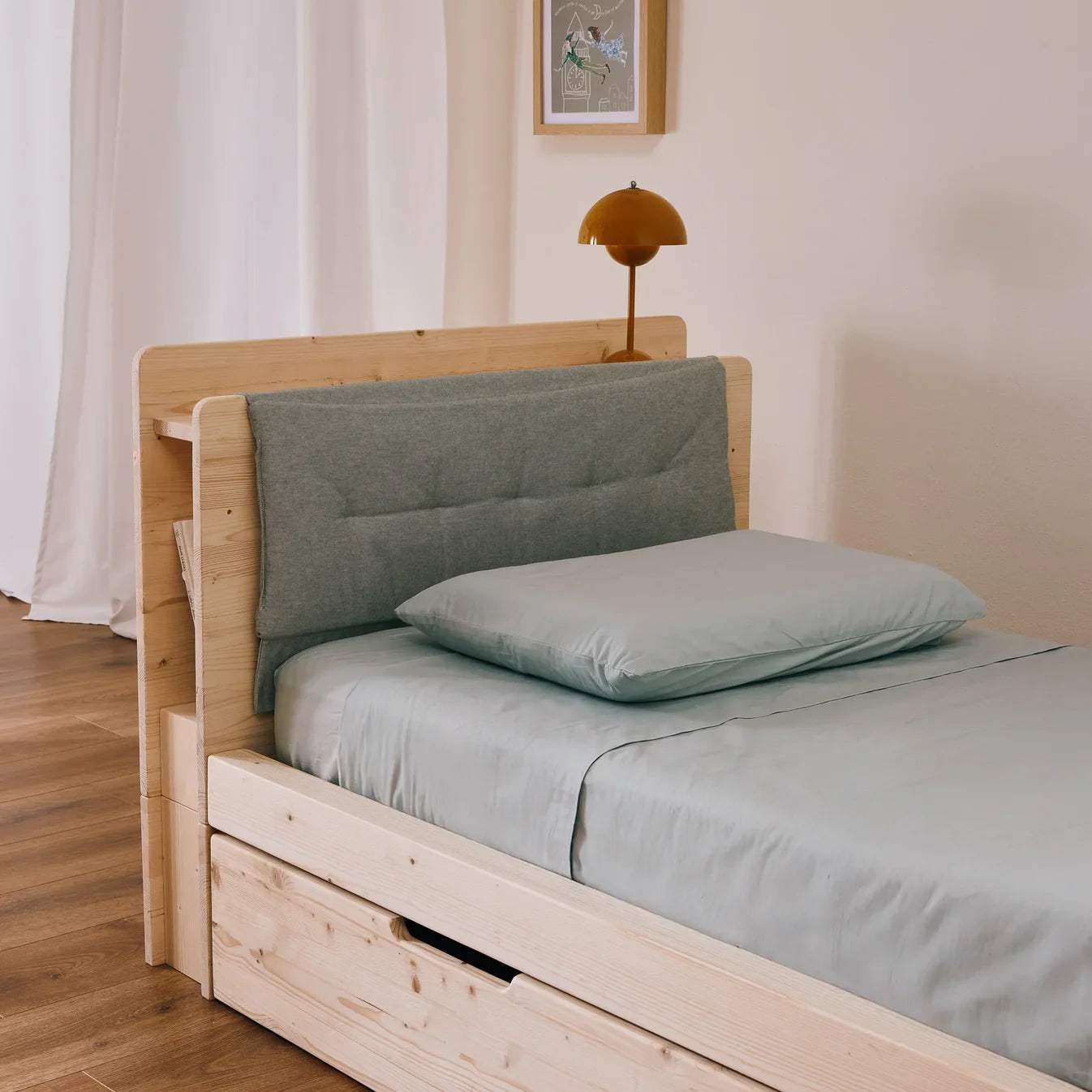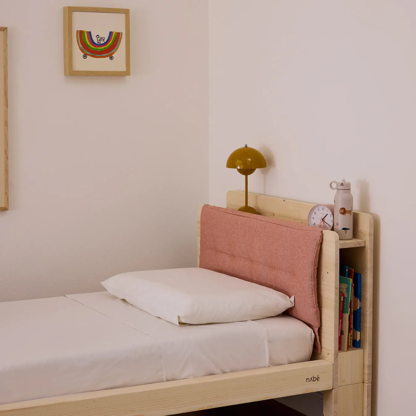 Die innovative Rückenlehne mit integrierter Regalstruktur bietet Platz für Bücher, kleine Schätze und all die Dinge, die das Gute-Nacht-Ritual besonders machen. Sie wird sicher und stabil am Bettrahmen befestigt und verfügt über ein offenes Regal, zwei seitliche Fächer und eine zentrale Klappe mit praktischer Öffnung von oben.